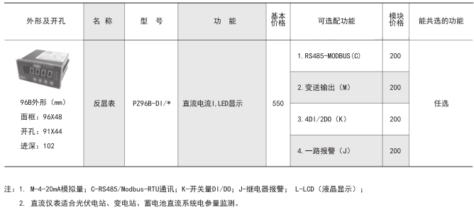 • PZ96B系列單相表,采用交流采樣技術,可直接或間接測量單相電網中電壓、電流等。既可用于本地顯示,又能與工控設備連接,組成測控系統(tǒng)。儀表可具有RS-485通訊接口,采用Modbus-RTU協(xié)議;可帶模擬量輸出、繼電器報警輸出、開關量輸入/輸出。根據(jù)不同要求,通過儀表面板按鍵,對變比、報警、通訊等參數(shù)進行設置和控制。